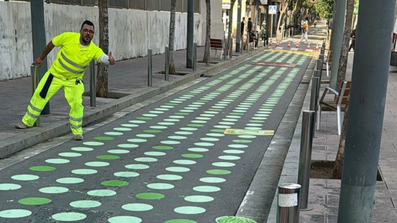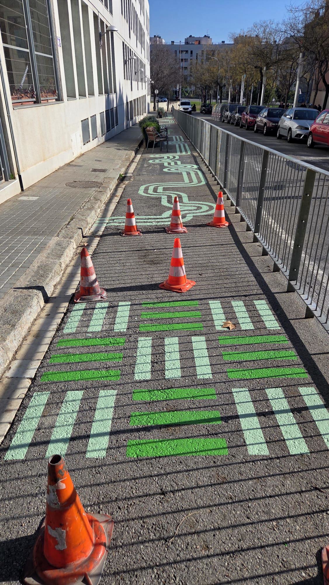 Esta actuación de señalización horizontal en zona escolar en Barcelona incluye el pintado en color verde y la aplicación de marcas viales específicas, diseñadas para destacar el carácter escolar de la vía y reforzar la atención de los vehículos.